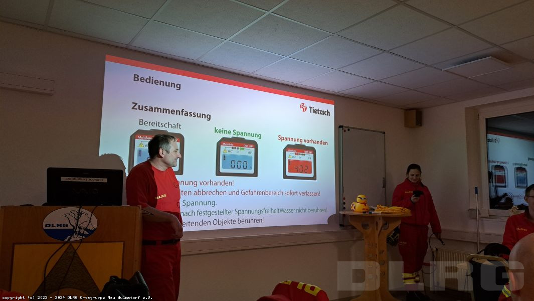 spannungsführend sein. Das Wasser kann so in überfluteten Kellern große Gefahren mit sich führen. Nach DGUV Vorschrift 49 (ehem. GUV-V C53)müssen Maßnahmen ergriffen werden, dass Einsatzkräfte nicht durch elektrischen Strom gefährdet werden. Diese zuvor nicht genau definierten Maßnahmen wurden jetzt durch die Berufsgenossenschaft BG-ETEM festgelegt. Zudiesen geeigneten Maßnahmen gehören Spannungswarner für überflutete Bereiche.