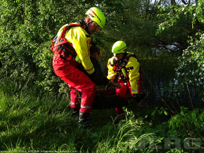 Unsere Sanitäter reanimierten den Fahrer und betreuten die unter Schock stehende Mitfahrerin. Parallel suchten unsere Strömungsretter den See nach der vermissen Person ab, welche nach kurzer Zeit und trotz guter Tarnung gefunden werden konnte.