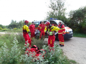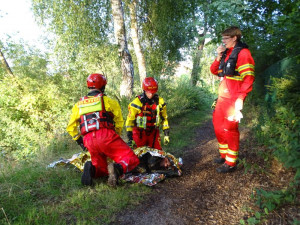 Die Vitalfunktionen kontrolliert, einen Stifneck zur Stabilisierung angelegt, wurde sie vorsichtig auf dem Spinboard fixiert und zum Rettungswagen am Ende des Sees gebracht.