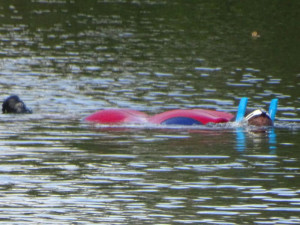 Tatsächlich war eine treibende Person in Mitte des Sees sichtbar. Die beiden Strömungsretter schnappten sich das Spineboard und schwammen sofort dorthin und verbrachten ihn ans nächstgelegene Ufer, wo er von weiteren Einsatzkräften übernommen wurde.