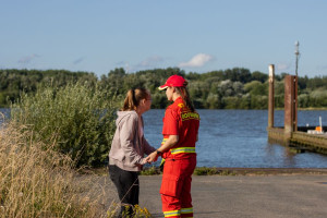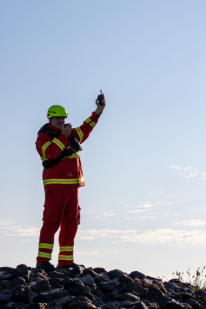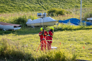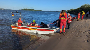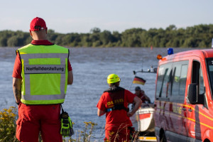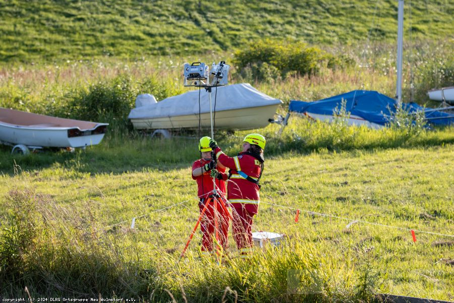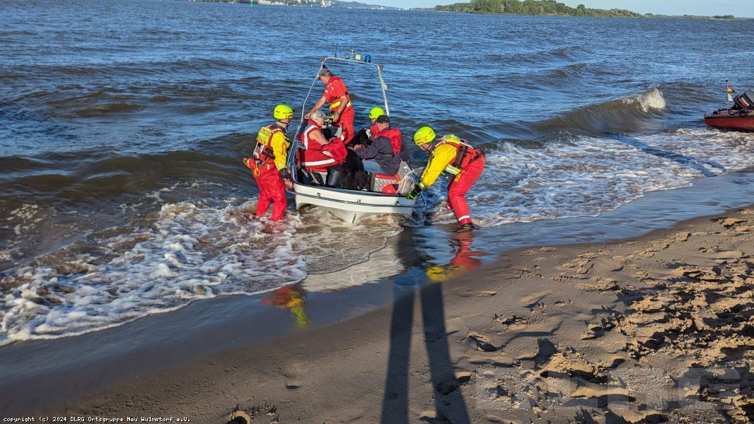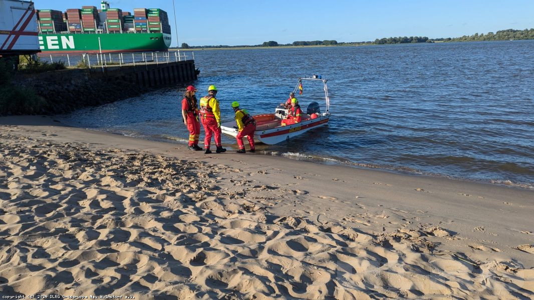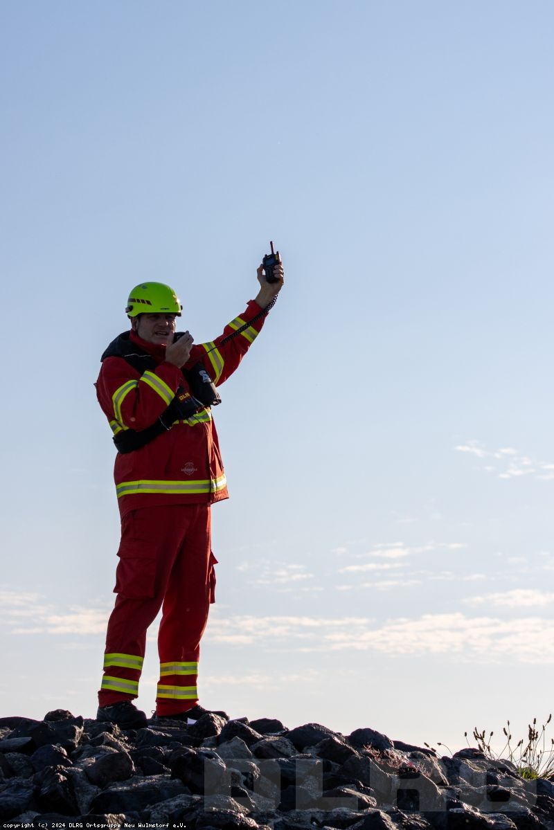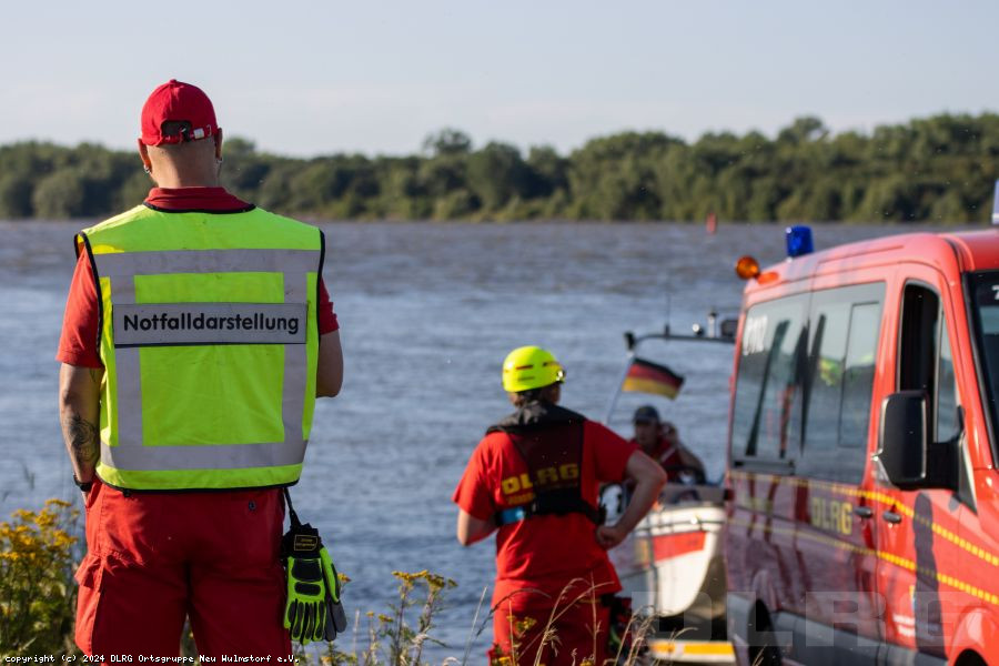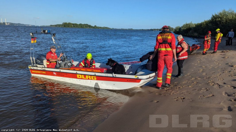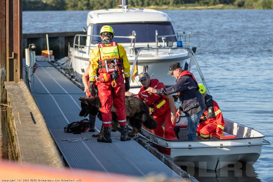 abgebrochen. Während die Zeugin durch die Einsatzkräfte betreut und gleichzeitig über die Umstände gefragt wurde, machten weitere Einsatzkräfte unser Schlauchboot „Dwarslöper“ bereit zum Slippen. Die Bootsbesatzung suchte die Elbe systematisch wasserseitig und andere Einsatzkräfte den Bereich rund um den Yachthafen landseitig ab. Ein paar Kilometer elbabwärts machten die havarierten Mimen (= Darsteller) schließlich die Bootsbesatzung auf sich aufmerksam. Zwar konnten sie sich an einen kleinen Strand retten, allerdings war der Landweg (im Übungsszenario) überflutet, so dass die Rettung nur per Boot möglich war. Der zur Bootsbesatzung gehörende Strömungsretter suchte den näheren Uferbereich nach großen Steinen oder Hindernissen ab, die das Boot beim Anlanden auf dem Strand beschädigen könnten. Im Anschluss wurden die fünf Mimen durch die Bootsbesatzung betreut. Besonders war hierbei, dass nicht nur die fünf Mimen, sondern erstmals in einer unserer Übungen auch zwei Hunde durch die Bootsbesatzung zurück zum Yachthafen gebracht werden mussten. Dies erfolgte gemeinsam mit der nachrückenden Bootsbesatzung des Mehrzweckbootes „de Voshüser“ in mehreren Fahrten. Hier errichteten die im Yachthafen verbliebenden Einsatzkräfte einen fiktiven Versorgungsplatz. Aufgrund der untergehenden Sonne wurde die Beleuchtung aufgebaut, um eine Ausleuchtung der Einsatzstelle in der späteren Dämmerung sicherzustellen.