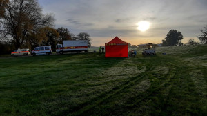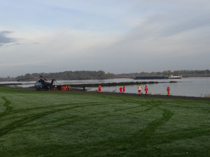 An der Einsatzstelle in Laßrönne, direkt an der Elbe angekommen, machten wir unsere Feldküche klar und bereiteten erst einmal Frühstück und Kaffee für die Einsatzkräfte zu, während sich der Hubschrauber für den ersten Flug bereit machte.