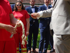 Im Anschluss musste Felix, als Symbol für ihre gemeinsame Zukunft, ein dickes Tau, mit einem kleinen, nicht sehr scharfen, Messer durchschneiden.