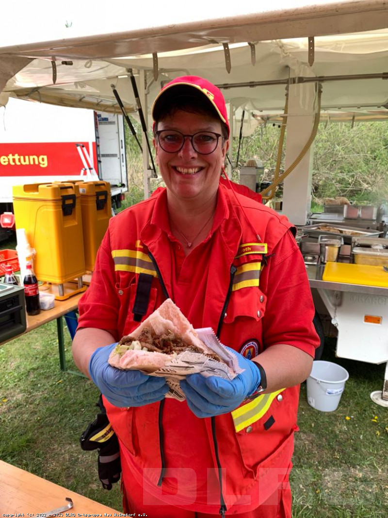 Während des Ausslippens der Boote hatte die Feldkücheneinheit schon die Mittagsverpflegung vorbereitet. Die Wasserretter konnten sich mit frischem Gyros aus dem Fladenbrot stärken.