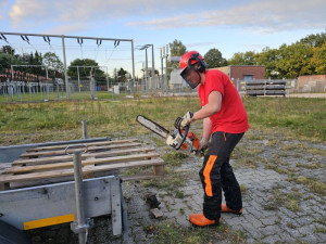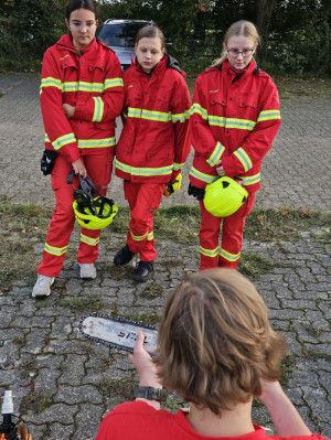 über den Einsatz von Kettensägen in den verschiedenen Einsatzszenarien der DLRG. Gemeinsam wurden Punkte wie der sichere Umgang, die persönliche Schutzausrüstung (PSA), die Ausstattung der Ortsgruppe sowie die Technik der Kettensäge besprochen. Nach dem Vortrag ging es in den praktischen Teil über. In Gruppen wurden die Verwendung des Greifzuges zur Bewegung von schweren Lasten sowie der praktische Teil der Kettensäge durchgeführt. Der Fokus lag in beiden Fällen auf der korrekten Verwendung, Anwendungsbeispielen und der sicheren Handhabung. Hierbei erklärten Frederik und Leon den Einsatzkräften alles wichtige.