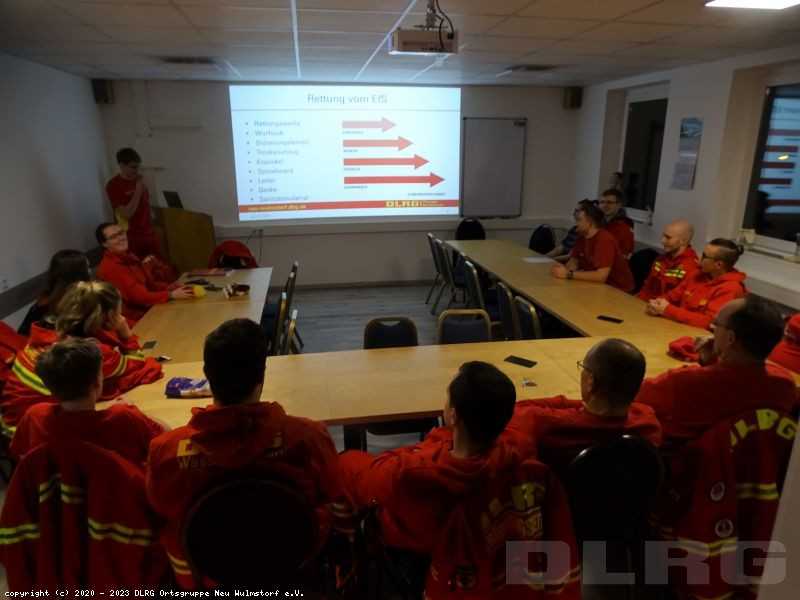 Dann ging es nach draußen, um mit den Einsatzkräften die Praxis der Eisrettung zu üben.