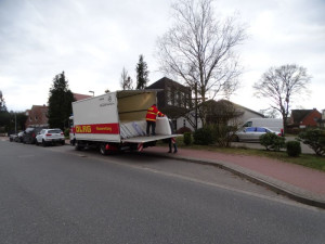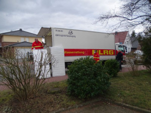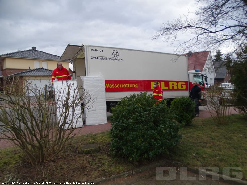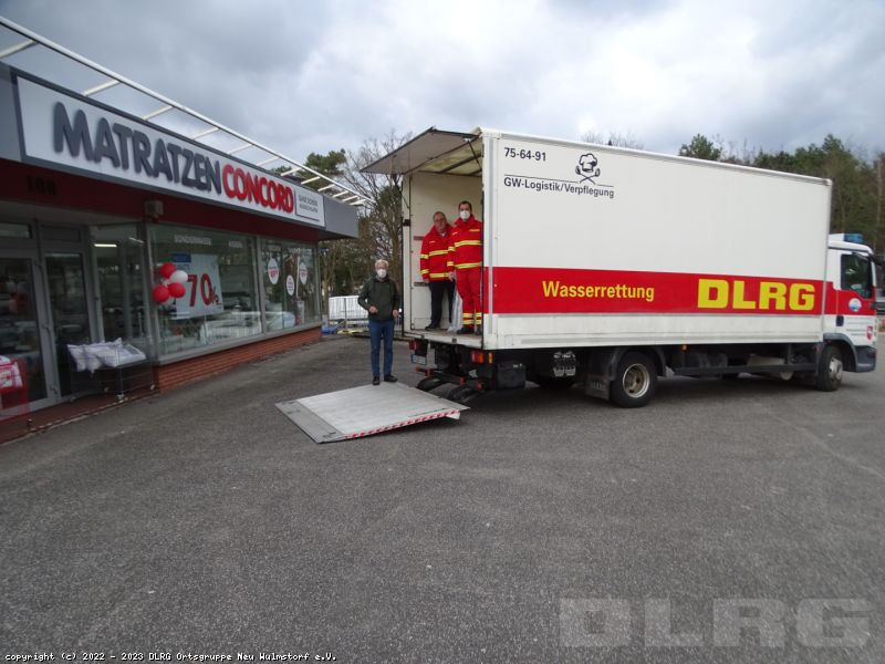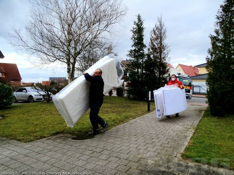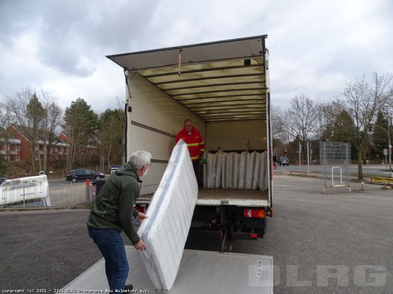 Auf den Bildern sieht man Helfer der DLRG Ortsgruppe Neu Wulmstorf, die die von einem Neu Wulmstorfer Geschäftsmann gespendeten Matratzen anliefern.