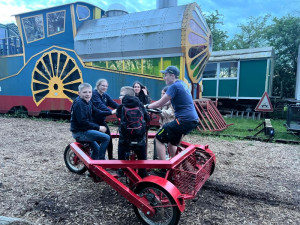 Währenddessen konnten von den Teilnehmern die Spaßfahrräder und vielfältigen Eisenbahnwaggons erkundet werden. Nach dem Essen durften wir auch noch eine kleine Runde mit den 6-Team Bikes drehen. Das ist ein Fahrrad, womit man mit 6 Leuten zusammenfahren kann. Anschließend ging es zum Glück ohne Stau wieder nach Neu Wulmstorf, wo die Teilnehmer müde, aber glücklich von ihren Eltern abgeholt wurden.