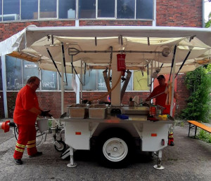 Am Freitagmorgen starteten wir erst einmal zu dritt mit dem vollgepackten LKW und der Feldküche Richtung Maschsee. Ständig Stau auf der Autobahn, wegen Bauarbeiten sorgten dafür, das wir erst mit 2 Stunden Verspätung dort ankamen. Ruckzuck alles abgeladen, die Feldküche und die Modulküche startklar gemacht, machten wir uns an die Zubereitung der Mahlzeit. Durch die Verspätung änderten wir den Essensplan und bereiteten Köttbullar mit Champignons, Nudeln, und Gurkensalat zu. Am Abend kamen noch 3 Kameraden nach ihrem beruflichen Feierabend dazu. Nun war unser Team vollständig.