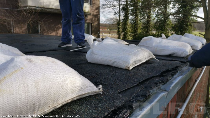 Damit nicht noch mehr Schaden entsteht, haben einige unserer Einsatzkräfte die Dachpappen der Garagendächer gesichert.